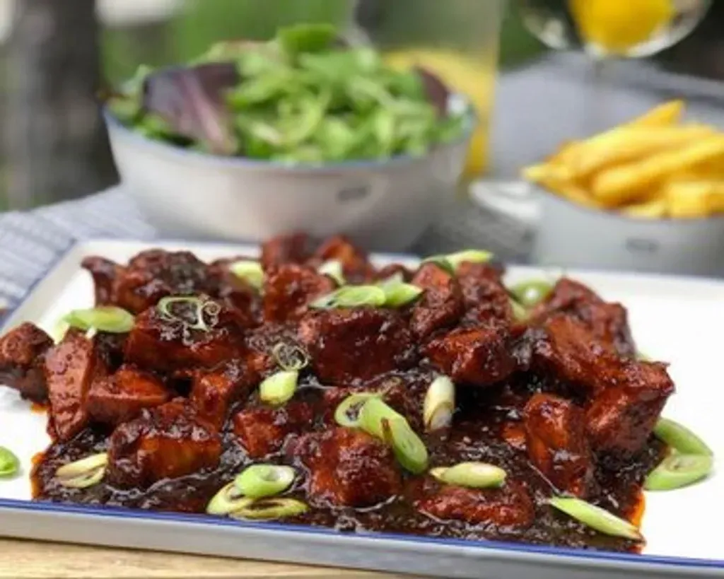 Bijzonder smakelijke gebraden kippendij, geserveerd met: